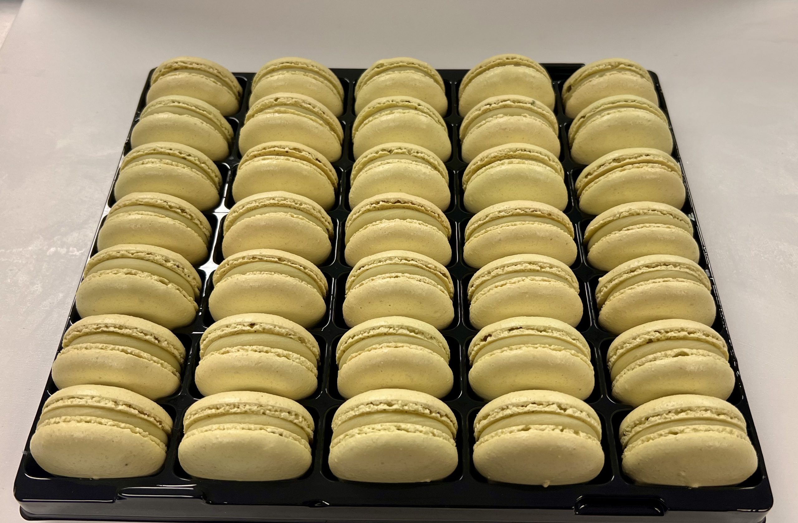Sugar, ground almonds, egg white, egg white powder, crème of tartare, cornflour, salt. white chocolate, (Sugar, Cocoa Butter, Whole Milk Powder, Emulsifier: Soya Lecithin, natural vanilla flavouring) double cream (milk), pistachio, vegetable oil, butter (milk), almond extract, safflower, spirulina processed with water , maltodextrin and citric acid .