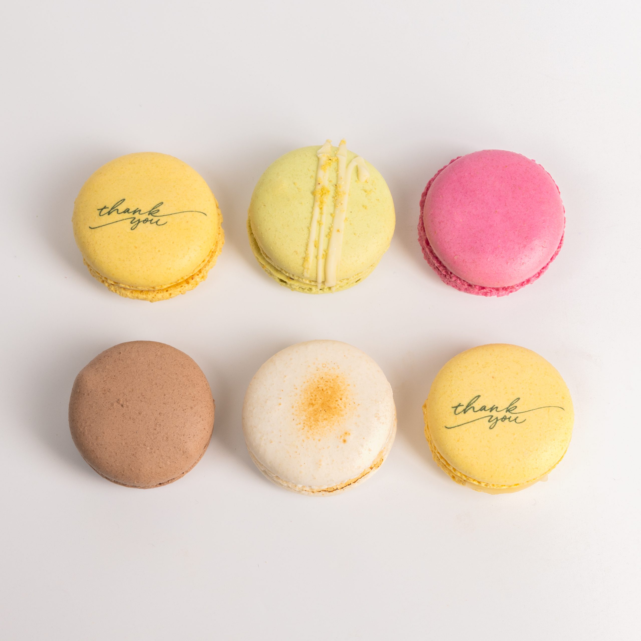 6 or 12 Macarons – 2 Passion Fruit, 1 Pistachio, 1 Raspberry/Rose, 1 Dark Chocolate, 1 Crème Brûlée